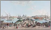 By 1823 DeWolf established one of the four American mercantile houses that were operating in Honolulu at that time.[22] These trading houses were stocked with goods that were in demand by Native Hawaiians and the growing number of Americans and other foreigners who lived in Hawaii. Profits were made by selling goods mostly in exchange for Hawaiian sandalwood (ʻiliahi or ʻiliahialoʻe), which was a booming business in the 1820s. As whaling ships began visiting Hawaii in larger numbers the mercantile community grew and whaling bills of exchange became increasingly common. By 1830 Hawaii had become a major commercial center for the entire North Pacific, with connections to California, China, Russia, and many Pacific Islands. The main ports of call were Honolulu on Oahu and Lahaina on Maui. American goods were largely brought from New England, and buildings commonly used a distinctly New England style similar to the "Yankee" architecture of the whaling centers of New Bedford and Nantucket.[23]