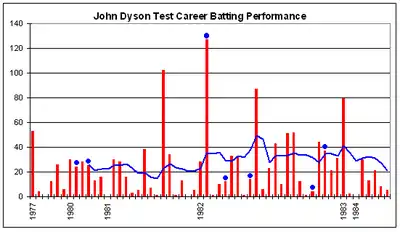 In February 1981 Ian Chappell left out Dyson from Chappell's hypothetical test squad to England "because he seems to have a mental barrier about making big scores in test cricket."[38]