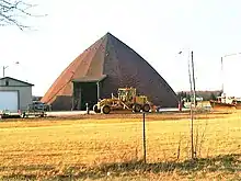 John Fitzpatrick invented a structure known as the Fitzpatrick Dome to store large quantities of road sand/salt mixtures used to treat roads in winter when ice and snow make driving hazardous. The igloo type design was helpful in areas where snowfall would otherwise accumulate on a flat-roof structure. The dome is a 20-sided conical shell 100 feet in diameter and 50 feet in height. As it is prefabricated, larger or smaller domes can be erected simply by adding or deleting rings.[9][10]