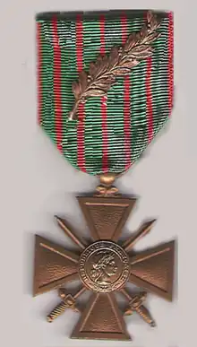 Elkington was taken to a hospital at Grenoble in south-east France; he remained there for ten months and had to spend the first eight months lying flat on his back.[1][18] The French commander-in-chief, General Joseph Joffre, ordered that Elkington receive the Médaille militaire and be mentioned in orders (receiving palm leaves for his Croix de Guerre). These decorations were presented at the hospital by a general.[1][14] Elkington was also promoted to the rank of corporal.[1] Wheeler also recovered and remained with the legion until 1917 when he joined the newly arrived American forces; he died four months before the end of the war.[20]: 128