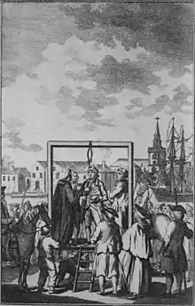 After his death, his body (along with those of his crew) was left in the River Thames. The bodies were then tarred and suspended on the riverbank, as a warning to other would-be pirates.[8]