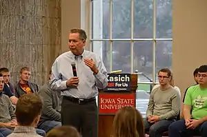 By the first week of January, Kasich had held his fiftieth town hall meeting in New Hampshire, more than any other presidential candidate in the state.[16] A Monmouth University poll released on January 11 showed Kasich in second place in New Hampshire, tied with Ted Cruz, both with 14%.[17] Explaining his rise to being tied for second place in New Hampshire, Kasich reasoned on January 12 that his increased numbers were due to him having substance and that he believed a victory in the state would give the Kasich campaign "momentum that could take us all the way to the nomination."[18]
