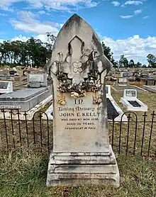 On 26 August 1862 he married Margaret Agnes Tierney, with whom he had seven children. In 1887 he was elected to the New South Wales Legislative Assembly as a Free Trade member for Bogan. He was defeated in 1889. Kelly died at Peak Hill in 1896[1] and was buried at the Peak Hill Cemetery[2][3]