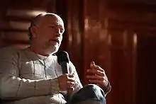 Malkovich stated in a 2011 interview that he is not a "political person" and that he does not have "an ideology", revealing that he had not voted since George McGovern lost his presidential run in 1972.[57] At the Cambridge Union Society in 2002, when asked whom he would most like to fight to the death, Malkovich replied that he would "rather just shoot" journalist Robert Fisk and politician George Galloway, stating that Galloway was not honest. Journalists speculated that the comment was related to criticism of Israel and the war in Iraq.[58][59]