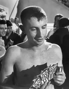 ![]() Marshall holding 1950 AAU title badges | ||||||||||||||||||