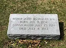 Archbishop Feehan celebrated the Requiem Mass and Bishop Spalding preached the sermon.[8] McMullen was initially buried in the crypt of St. Margaret's Cathedral, and then his body was transferred to the crypt of Sacred Heart Cathedral after it was built. His remains were eventually transferred to the Bishop's Circle of Mt. Calvary Cemetery in Davenport. McMullen Hall, a classroom building at St. Ambrose, was named in his honor.