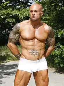 John Joseph Quinlan (born October 30, 1974)[4][5] nickname Stoneface,[8][9][10] is an American actor.[11][12] He is a former bodybuilder, professional wrestler, fitness model, fashion model, art model and romance cover model.[13] In 2012 he was an official image model and brand ambassador for the supplement company Nutrabolics.[14][15] In December 2015, Quinlan was signed on as the lead male actor for the 2019 film, A Sense of Purpose: Fighting For Our Lives[16] by producer Jillian Bullock.[17] In February 2020, Quinlan was selected to play the villain role of Marvel Rhino for the TV/Web Series: Spider-Man And The Monsters of Manhattan[18] set to be released in 2024.[10]