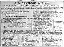 Hamilton was an early member of the Literary Club of Cincinnati (1857), and was made a Fellow of the fledgling American Institute of Architects on April 3, 1860.[7] Prominent Cincinnati architect Samuel Hannaford, also born in England but brought to the Cincinnati area as a child, got his start in Hamilton's office in 1857.