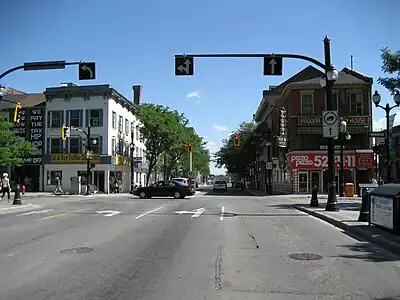 John Street is a Lower City arterial road in Hamilton, Ontario, Canada. Originally it was known as Mountain Road or Ancaster Road. It starts off at the base of Arkledun Avenue, a Mountain-access road in the city, just east of St. Joseph's Hospital, where it is a one-way street going north and tunnels underneath the Hunter Street Railway bridge and continues onward to the city's North End at the waterfront, where it ends at Guise Street East, the site of Pier 9.