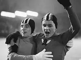 ![]() Kees Verkerk and John Tipper (right) after skating 5000 m at the 1967 World Championships | |