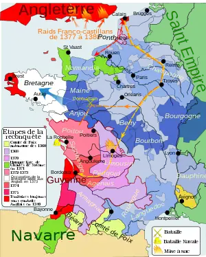 - ↑ "L'Angleterre sous les Plantagenêts (XII° - XIV°) / chapitre sixième : Edouard III et Richard II, les derniers Plantagenêts / V : Seconde phase du conflit : la guerre Caroline (1369 à 1389)" (in French).