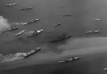 To make room for the target ships, 100 short tons (90 t) of dynamite were used to remove coral heads from Bikini Lagoon. On the grounds of the David Taylor Model Basin outside Washington, DC, dress rehearsals for Baker were conducted with dynamite and model ships in a pond named "Little Bikini."[36] A fleet of 95 target vessels was assembled in Bikini Lagoon. At the center of the target cluster, the density was 20 ships per square mile (7.7 per km2), three to five times greater than military doctrine would allow. The stated goal was not to duplicate a realistic anchorage, but to measure damage as a function of distance from the blast center, at as many distances as possible.[37] The arrangement also reflected the outcome of the Army/Navy disagreement about how many ships should be allowed to sink.[38]
