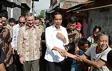 With incumbent president Susilo Bambang Yudhoyono hitting term limits in 2014, Jokowi was seen as a major contender for the position due to his popularity and he topped initial polls.[8] Initially, Jokowi himself did not directly respond to media inquiries regarding his possible candidacy.[5][9] During his governorship, his blusukan (impromptu visits) habit which he started doing during his mayoral term, became a center of attention outside his programs.[10]