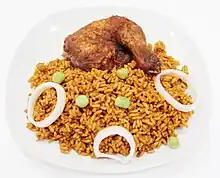 ![]() Jollof rice with stew and garnish | |