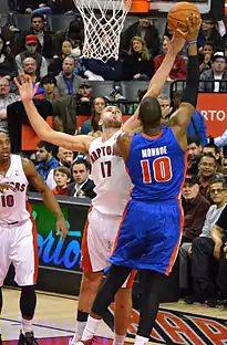 In the Raptors' season opener on 26 October 2016, Valančiūnas recorded a then career-high 32 points and 11 rebounds in a 109–91 win over the Detroit Pistons.[32][33] On 10 January 2017, Valančiūnas grabbed a then career-high 23 rebounds to go with 18 points in a 114–106 win over the Boston Celtics.[34] On 31 March 2017, Valančiūnas made team history in the third quarter of the Raptors' 111–100 win over the Indiana Pacers. He had 13 of his 17 rebounds during the quarter, setting a franchise mark for most in a single period. He also had 16 points for his team-leading 28th double-double of the season. He also established a career high during the game, surpassing the 714 rebounds he had in the 2013–14 season.[35]