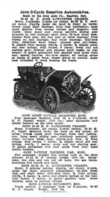 The Jonz automobiles and Jonz trucks were built by the Jonz Automobile Company as an American vehicle from 1908 through 1914. The early vehicles were built at the Jonz factory at Seventh and Doane Streets in Beatrice, Nebraska[1] and were later produced in New Albany, Indiana. The Jonz company was founded by inventor Charles Chesterfield ("C. Chester") Jones and his two brothers. Three different models of Jones' patented "vapor cooled engine" cars were initially offered, a roadster, a runabout and a touring car. These models could be ordered with one of three different versions of Jones' patented "Jonz Tranquil Motor".