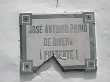 The postwar cult of personality had two ubiquitous icons. The first, a funereal slab placed on the external wall of many churches and cathedrals which bore the crowning inscription, Caídos por Dios y por España ("Fallen for God and for Spain"), followed by a list of local Nationalists killed during the war; Primo de Rivera's name headed every list.[38] The second was the rallying cry, "José Antonio—¡Presente!," a figurative reply to an imaginary roll call invoking his ghostly attendance or immanence.