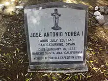 Upon his death in 1825 he was buried at his request in an unmarked grave in the cemetery at Mission San Juan Capistrano. A cenotaph was later placed in Yorba's honor.