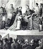 Morelos had ambitions for something more than working with his hands, and assiduously studied; his maternal grandfather was a school teacher.[8] In 1789, he enrolled in the Colegio de San Nicolás Obispo in Valladolid, where Father Miguel Hidalgo y Costilla was rector.[8] When he was ordained a priest, he, as with many others without connections, had no benefice to guarantee any income as a priest.[8] However, as a secular cleric, he took no vow of poverty and could freely pursue business activities to make a living.[8]