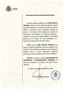 In November 2009 his great-grandson managed, in the framework of the law of historical memory of Spain (2007), a statement of moral reparation and personal recognition by the Ministry of Justice, awarded to those who unjustly suffered persecution or violence during the Civil war and Franco's dictatorship. They have also received the same recognition, among others, Miguel Hernández and Lluís Companys. In November 2011 Tormos city council decided to give the name "Alcalde José Perelló Torrens" to a new street as an act of recognition to the labour of José Perelló Torrens.