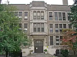 This building was designed by architect Irwin T. Catharine and built between 1926 and 1927. It is a three-story brick building, nine bays wide with projecting end bays, and was designed in the Late Gothic Revival style. An addition was built in 1954.[2] The school is named for illustrator Joseph Pennell (1857–1926).[3]
