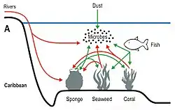 - ↑ de Goeij, JM; van Oevelen, D; Vermeij, MJ; Osinga, R; Middelburg, JJ; de Goeij, AF; Admiraal, W (2013). "Surviving in a marine desert: The sponge loop retains resources within coral reefs". Science. 342 (6154): 108–110. Bibcode:2013Sci...342..108D. doi:10.1126/science.1241981. PMID 24092742. S2CID 6720678.