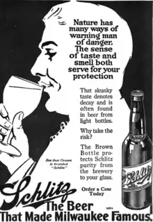 Joseph Schlitz Brewing Company was an American brewery based in Milwaukee, Wisconsin, and was once the largest producer of beer in the United States. Its namesake beer, Schlitz ( /ˈʃlɪts/), was known as "The beer that made Milwaukee famous" and was advertised with the slogan "When you're out of Schlitz, you're out of beer".[1] Schlitz first became the largest beer producer in the US in 1902 and enjoyed that status at several points during the first half of the 20th century, exchanging the title with Anheuser-Busch multiple times during the 1950s.[2]