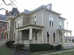 Born near Tiffin, Ohio in 1830, Joseph R. Bartlett moved to Lower Sandusky (now Fremont) in 1833 with his family. After reading law under his father, young Bartlett entered the legal profession and soon became one of Sandusky County's leading citizens. By the early 1870s, he and his wife Rachel had become sufficiently prosperous to erect a grand house on Park Avenue south of the Sandusky County Courthouse.[2] Choosing limestone for the foundation, weatherboarding for the walls, and an asphalt roof, the Bartletts arranged for the construction of an ornate house that mixed elements of the Italianate and Second Empire styles of architecture.[3] Many distinctive architectural elements characterize their house, including peaked dormers on the mansard roof, a large tower on one corner, ornate carvings on the porch, detailed hood molding, and an elaborate set of carvings and plaster work on the interior. Even the doorways are distinctive: few Fremont houses feature an entrance through a corner tower in the manner of the Bartlett House.[2]