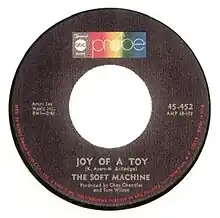 "Joy of a Toy" was the first USA single by the psychedelic rock band Soft Machine. It was released in 1968 to promote the group's debut album The Soft Machine. The single features edited versions of two songs, both being the only known mono mixes from that album. Kevin Ayers would employ the song's title for his debut solo album, Joy of a Toy, a year later, even though it does not feature the song. According to Rob Chapman, the title of the A-side was taken from the name of an otherwise unrelated composition by Ornette Coleman.[1]
