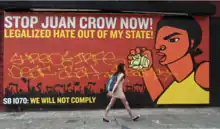 The term Juan Crow was first used to refer to immigration enforcement statutes in the United States that penalize illegal immigration and deny services to undocumented people living in the U.S. unlawfully.[12][13][14]