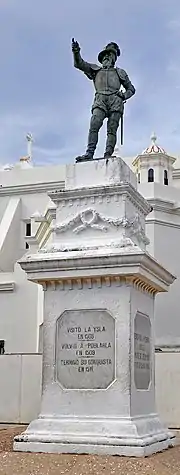 The official settlement of San Juan by Spaniards is often dated to 1508, when Ponce landed in a caravel with about fifty men on the southern coast of the island, but there is documentation in the Archive of the Indies (Archivo General de Indias) that he had led an expedition there with several hundred men as early as 1506, under orders by Governor Ovando to explore, settle, and conquer the island.[46] Puerto Rican scholar Aurelio Tió wrote two books which contain much archival material concerning Ponce de León, including documentation he discovered in Spain and in Puerto Rico.[47] He writes in detail of the Probanza de Juan González, according to which a temporary base was established on the west coast of Puerto Rico near the Bay of Añasco in 1506.[48][49] This earlier trip was said to have been done quietly because the Spanish crown in 1504 had commissioned Vicente Yáñez Pinzón to explore the island and build a fort.[50] Pinzón did not fulfill his commission and it expired in 1507, leaving the way clear for Ponce de León.[51]