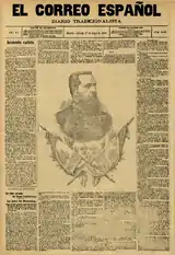 At unspecified time though probably in the mid-1880s de Mella commenced co-operation with some conservative periodicals; the two[52] identified are La Restauración, a Madrid weekly managed by Francisco de Paula Quereda,[53] and the Santiago daily El Pensamiento Galaico.[54] Little is known about his contributions, as there are almost no copies of both preserved in the archives.[55] At least his Pensamiento pieces must have made an impact beyond Galicia, as they were noticed in Madrid; this refers in particular to a series of vehemently anti-Nocedal articles, published in wake of the Integrist breakup from Carlism in the late 1880s.[56] As the breakaway Nocedalistas controlled El Siglo Futuro, previously the national party mouthpiece,[57] the claimant Carlos VII decided to set up a new semi-official Carlist newspaper; the daily materialized in 1888 as El Correo Español,[58] desperately short of good contributors. According to some scholars it was the Carlist political leader, Marqués de Cerralbo, who invited de Mella to contribute;[59] according to the others, it was rather the manager of Correo, Luis Llauder.[60]