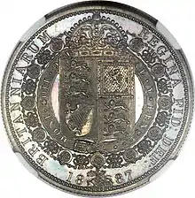 For the various reverses, according to Dyer and Gaspar, "Fremantle had revived some of the finest heraldic designs from the past".[16] He felt that a reverse design with the denomination inside a wreath was "feeble", and sought artistic designs.[16] Fremantle selected designs originating with the Great Recoinage of 1816–1817 or even further back, and these were engraved by Wyon.[17] In 1873, soon after he had assumed the deputy mastership, Fremantle had secured the return of Benedetto Pistrucci's 1817 design of Saint George and the Dragon to the sovereign,[16] for the first time in almost half a century.[18] This design appeared on the gold sovereign, double sovereign and five-pound piece of the Jubilee coinage, and also on the silver crown, or five-shilling piece.[19] Beginning with the Jubilee coinage, a plume was restored to Pistrucci's design; it had featured in his original work, but had later been omitted.[20] The sixpence, shilling, florin, half crown, half sovereign and a new coin, the double florin, were given variations of the ensigns armorial of the United Kingdom. This was done in several guises: thus, according to the proclamation making them current that was issued in May 1887, the half sovereign had a "garnished Shield surmounted by the Royal Crown" while on the half crown, they were "in a plain Shield surrounded by the Garter, bearing the Motto 'Honi soit qui mal y pense' and the Collar of the Garter".[19] The half sovereign's reverse design was a slight modification to those of earlier Victorian half sovereigns, and its crowned shield did not differ much from designs used since the denomination had originated in 1817.[21] Each of the reverses for the sixpence and above carried the date of minting, but none carried a statement of the coin's monetary value.[22] The sixpence had borne a wreath surrounding a statement of its value since 1831,[23] with one reason for this being that it was the same size as the half sovereign, and was sometimes fraudulently plated to pass as one.[7]