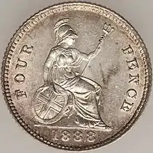 Groats, or fourpence pieces, had not been struck for circulation in Britain since 1855. Disliked because they were the same diameter (though somewhat thicker) than the threepenny bit, they retained some popularity in Scotland, and circulated in British Guiana as the equivalent of a quarter guilder. An issue of groats was made in 1888, the last of its series. Although valid currency in the United Kingdom, they were intended for British Guiana, and bore Boehm's Jubilee head on the obverse, with the William Wyon reverse used since the currency groat's initial issuance in 1836.[51]