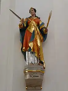 Juliana was beheaded after suffering torture in 304,[5] during the persecution of Maximian. It is said that part of her torture was being partially burned in flames, plunged into a boiling pot of oil, and finally beheaded. Another Christian named Saint Barbara suffered the death of a martyr along with Juliana and was likewise sainted.[6]