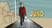 Juno's opening title sequence, depicting a rotoscoped Juno walking through her town while drinking a bottle of SunnyD orange drink, was put together over 7–8 months[39] by a small design studio, Shadowplay Studio, based in Los Angeles.[60] Reitman had met the studio's co-founder Gareth Smith in Japan on the short film festival circuit where they each had shorts screening.[60] Shadowplay created the opening title sequence for Reitman's previous film, Thank You for Smoking, and he contacted them again when he found out he was going to direct Juno.[61] With vintage 1970s punk-rock posters as inspiration, Smith and artist Jenny Lee decided to create a sequence that "had texture and a little bit of edge, but also imparted the warmth and heart of the screenplay".[62] In the last days of filming in Vancouver,[62] Page was photographed with a high speed camera from a number of angles walking on a treadmill and drinking SunnyD.[60] 900 still images of a walking and drinking Page were printed out and repeatedly run through a Xerox machine to degrade their quality until the pictures appeared hand-drawn.[61] The pictures were cut out and scanned back onto the computer, then layered onto the background drawn by Lee with compositing software[60] to create a stop motion animation sequence that corresponded to "All I Want Is You" by Barry Louis Polisar, the song Reitman had chosen.[50] Shadowplay also designed the titlecards for each of the seasons for the film,[39] hand-made a custom typeface for the opening title sequence and the closing credits, and collaborated on the design of the soundtrack and the DVD.[62]