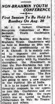 A youth conference for non-Brahmins was held in Bombay, with Adv J S SAVANT  serving as the chairman of the reception committee. Was a weekly writer in the English daily “Justice “ of Madras when Sir Ramaswamy Mudaliar was its editor, President, Maratha Recruitment Board World War II, President Konkan prantic Non Brahmin Sangh