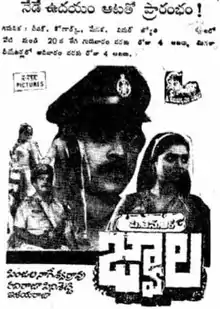 Jwala (transl. Volcano) is a 1985 Indian Telugu-language film, directed by Ravi Raja Pinisetty. The film stars Chiranjeevi in a dual role, Radhika, Silk Smitha and Bhanupriya. The film's score was composed by Ilaiyaraaja. The film was dubbed in Malayalam as Prathikara Jwala.[1][2][3] The film was remade in Kannada in 1987 as Sathyam Shivam Sundaram starring Vishnuvardhan in triple roles ( including the role of the father) unlike this movie.