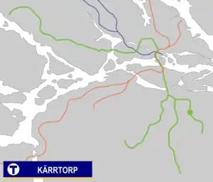 Kärrtorp metro station is on the green line of the Stockholm metro, located in Kärrtorp, Söderort. The station was inaugurated on 18 November 1958 as a part of the extension from Hammarbyhöjden to Bagarmossen.[2] The distance to Slussen is 5.5 km (3.4 mi).