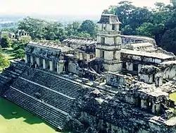 After his death, Pakal was deified as one of the patron gods of Palenque.[17] He was survived at least by his two sons Kan Bahlam and Kʼan Joy Chitam—each of whom subsequently also became Palenque's kʼuhul ajaw in his own right[18]—and two grandsons, Ahkal Moʼ Nahb (successor of Kʼinich Kʼan Joy Chitam II as kʼuhul ajaw of Palenque) and Janaab Ajaw, a royal official inaugurated under the reign of Kʼinich Kʼan Joy Chitam II.[19]