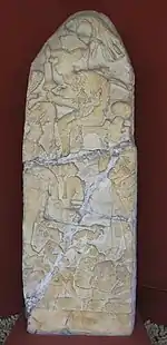 The final stela to be erected was Stela 12[5] and details Kʼinich Yat Ahk II's aforementioned victory over Pomona, showing KʼInich Yat Ahk II above military leaders and captives (of which a few are named).[9][10][11] Stylistically, the stela is more reminiscent of panels found at Piedras Negras, due to its "shallow relief[s]".[10] According to O'Neil, this style is evidence that at this time, "the sculptors … favored multi-figural pictorial narrative over the divine ruler's singular embodiment or three-dimensional presence."[10] Houston et al. argue that this stela is a "monument of vengeance", redressing the defeat of Piedras Negras at the hands of Pomona in 554 AD.[9] While the monument is not a niche stela, it makes reference to the style by showing the "seated ruler at the top ... and other people at lower levels", similar to Stelae 14 and 33.[10] The stela faces southwest, but this is because the monument was installed on the O-13 pyramid, which already faced in this direction. O'Neil has proposed, however, that the orientation was also purposeful, and that Kʼinich Yat Ahk II was trying to connect his stela with those of his forefathers.[10] Stela 12 is in a relatively poor state of preservation, as exposure has weathered it down.[11]