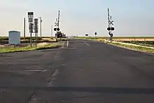 K-23 then enters Dighton, the only city in Lane County, becoming Main Street.[16] A few blocks into the city, is an intersection with K-96, known as Long Street, at a four-way intersection. K-96 here is codesignated as U.S. Bicycle Route 76 (Trans America Trail). As K-23 exits Dighton, it crosses the Kansas and Oklahoma Railway, and after roughly 2.3 miles (3.7 km) crosses Middle Fork Walnut Creek. The highway continues for 3.7 miles (6.0 km) and crosses North Fork Walnut Creek. The roadway continues for about 2.5 miles (4.0 km) and intersects K-4, southwest of Shields. Here K-23 curves west and overlaps K-4 for two miles (3.2 km) then turns north again and leaves K-4. After roughly 6.1 miles (9.8 km) the highway crosses into Gove County, at the Third Standard Parallel South.[11][15]