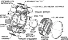 The Satellite Control Section (SCS), which forms the aft part of the SBA, started as Air Force Project 467. SCS was intended as a more capable replacement for the on-orbit propulsion, which had been provided by the Agena upper stage for previous generations of reconnaissance satellites. The SCS featured an increased diameter of 10 ft (3.0 m) (compared to 5 ft (1.5 m) for the Agena) and a length of 6 ft (1.8 m). It housed hydrazine propellant tanks for the pressure fed Orbital Adjust System (OAS) and the Reaction Control System (RCS). OAS and RCS were connected by a transfer line to facilitate propellant exchange. The tank pressure was maintained within the operational range by additional high pressure nitrogen tanks. The SCS incorporated a freon gas system for backup attitude control inherited from the Agena, commonly referred to as "lifeboat".[13] SCS was equipped with deployable solar panels and an unfurlable parabolic antenna for high data rate communication.[14]