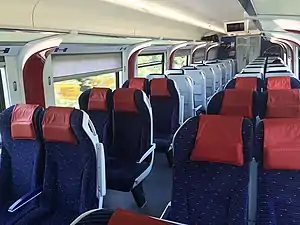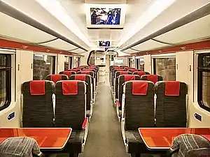 Standard Class: The seats are arranged in a 2+2 fashion, and have blue seat covers and red headrests. The seats have amenities such as a power outlet and a tray table, typical of long distance trains. In addition to this, it also features standard intercity offerings such as luggage racks, a toilet and prayer area within the length of an individual 6-car set. It has gang-ways interconnecting each coach, allowing passengers unrestricted movement throughout the entire length of the train. Since these trains will operate in a tropical climate, they have over-head air-conditioning systems, providing temperature control, ventilation and dehumidification to maximise passenger comfort. The trains are also equipped with LTE-enabled WiFi throughout but currently it has not been turned on yet.[5]