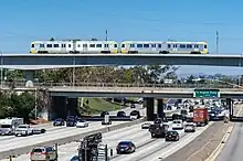 South of there, the route emerges from the tunnel and enters the Harbor Subdivision right-of-way, which runs parallel to Florence Avenue and Aviation Boulevard. The line mostly operates at-grade in this exclusive right-of-way, briefly transitioning onto elevated viaducts to cross over major thoroughfares including La Brea Avenue and I-405. Traveling the complete length of the line takes approximately 18 minutes.[5]