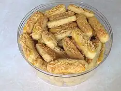 Kaasstengels (// ⓘ), Kastengel or kue keju are a Dutch cheese snack in the shape of sticks. Owed to its colonial links to the Netherlands, kaasstengels are also commonly found in Indonesia.[1] The name refers to its ingredients, shape and origin; kaas is the Dutch word for "cheese", while stengels means "sticks". Unlike most cookies, kaasstengels taste savoury and salty instead of sweet.[2]
