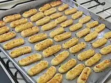 The dough is rolled into small rectangles, brushed with egg yolk, sprinkled with grated cheese, and then baked.[8] Nutritional yeast can be used as a substitute for cheese to make it suitable for a vegan diet.[9] These pieces of kaasstengels must be kept in an airtight container, e.g. tin, plastic or glass container, to maintain its freshness and crumbly texture.[6]