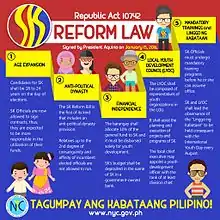 In January 2015, the Philippine House of Representatives unanimously passed a reform bill.[17] Among the reforms are raising the age of SK officials from between 15 and 17 years old to between 18 and 21, raising the age of voters from between 15 and 17 to between 15 and 21, an anti-dynasty provision that forbids candidates from having a relative in public office that is within the second degree of cosanguinity, and provisions to increase SKs' fiscal autonomy.[17] Immediately after passing the reform bill, the Philippine House passed a bill further postponing the SK elections from February 2015 to October 2016 to be held at the same time as the barangay elections of 2016.[17] In March 2015, a law postponing the elections to 2016 was signed by President Aquino,[18] but the elections were eventually held in May 2018.[3]
