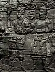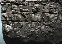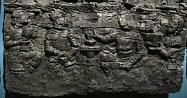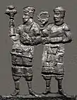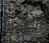 The adorants are dressed in knee-length tunics, with long boots over trousers, suggesting clothing styles similar to those found in the paintings of Penjikent, and wear shoulder ribbons which have been associated with Hephthalites nobility.[8] The gate is dated to the first half of the 6th century CE (500-550 CE), and the destruction of the palace is attributed to the Islamic conquest of Samarkand in 712 CE.[8][10]