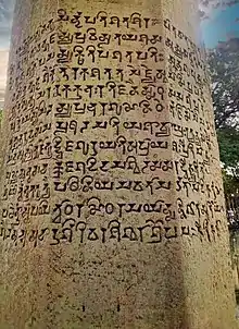 There is a 0.673 by 0.51 metres (2 ft 2.5 in by 1 ft 8.1 in) on the pillar with writing with characters belonging to eastern variety of Gupta alphabet similar to that of Samudragupta inscription of Allahabad Pillar. The inscription is written in Sanskrit language, and written in verses except for the first word, siddhaṁ.[9] The inscription defines reign of Skandagupta as peaceful and describes him as "commandar of a hundred kings".[10][11] The inscription also has an adoration to Arihant of Jainism.[3][7][12]
